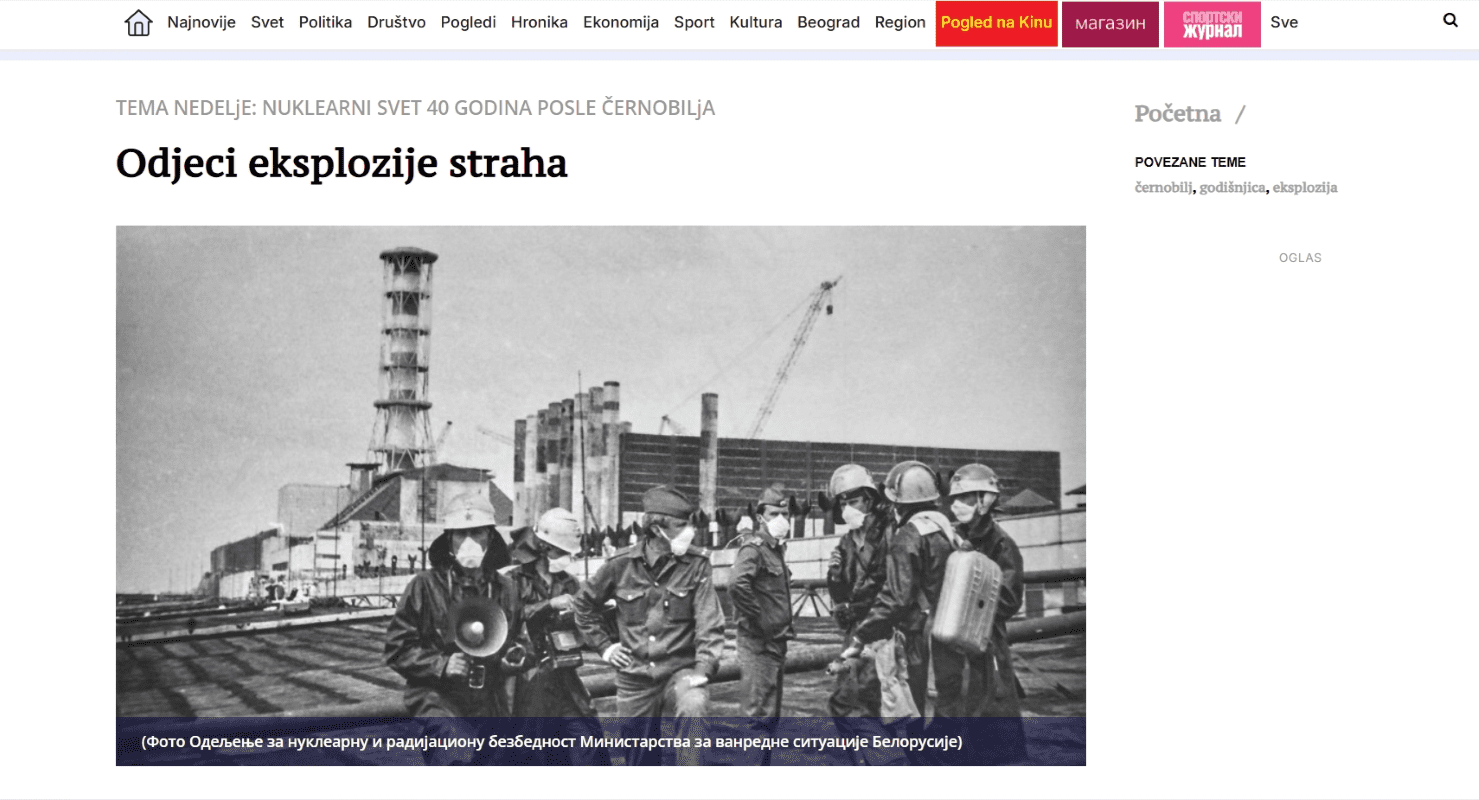 Објава „Политике“ – „Одјеци експлозије страха“, аутора Зорана Драче међународног експерта, Слађана Велинова, директора Директората за радијациону и нуклеарну сигурност и безбедност Србије и Бранислава Маричића, саветника директора Директората, поводом 40 година од несреће у нуклеарној електрани „Чернобиљ“, доноси анализу узрока, тока и последица катастрофе, као и њен дугорочни утицај на енергетску политику, уз осврт на капацитете Србије за реаговање у случају нуклеарних и радиолошких акцидената.