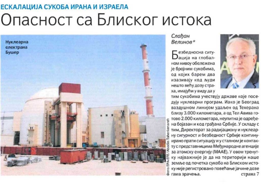 Директор Директората за радијациону и нуклеарну безбедност и безбедност Србије, Слађан Велинов, дао је ауторски текст за дневни лист Политика, у којем се осврнуо на актуелни сукоб између Израела и Ирана и његов потенцијални утицај на радијациону безбедност у региону.