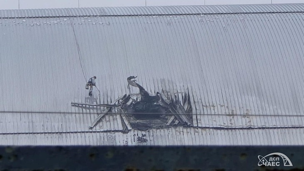 У фебруару 2025. године (14.02), кров заштитне куполе погођен је дроном на висини од око 87 метара. Удар се догодио изнад просторија у којима се налази технолошка опрема за даљински рад у оквиру NSC-а. Оштећене су и спољна и унутрашња облога лучне конструкције NSC-а, а откривен је и локални пожар на обе облоге, који је захватио изолациони материјал. Витална конструкција и инсталирани оперативни системи нису претрпели трајна оштећења.