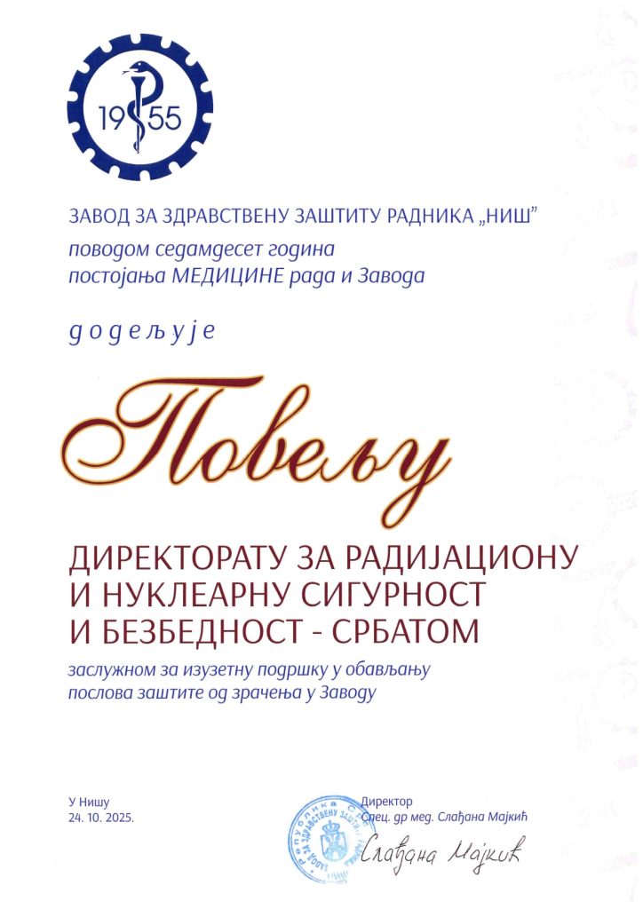 Поводом обележавања седамдесет година постојања медицине рада у Нишу, директорка Завода за здравствену заштиту радника „Ниш“ спец. др мед Слађана Мајкић доделила је посебну повељу Директорату за радијациону и нуклеарну сигурност и безбедност Србије, за изузетну подршку у обављању послова заштите од зрачења.